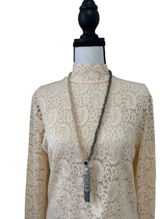 This exquisite necklace features a twisted dome centerpiece adorned with sparkling crystals. The luxurious tassel, embellished with additional crystals, adds opulence and movement. Perfect for both formal events and casual outings, this piece brings a touch of modern sophistication and glamour to any outfit.