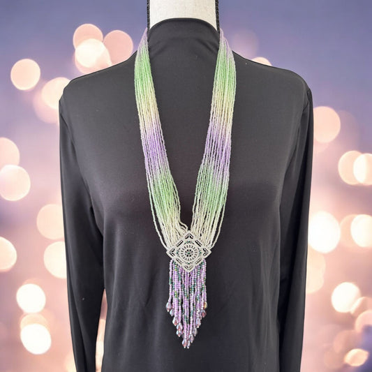 Long Shaded Small Crystal Beaded Square Pendant Necklace with Heavy Tassel Green