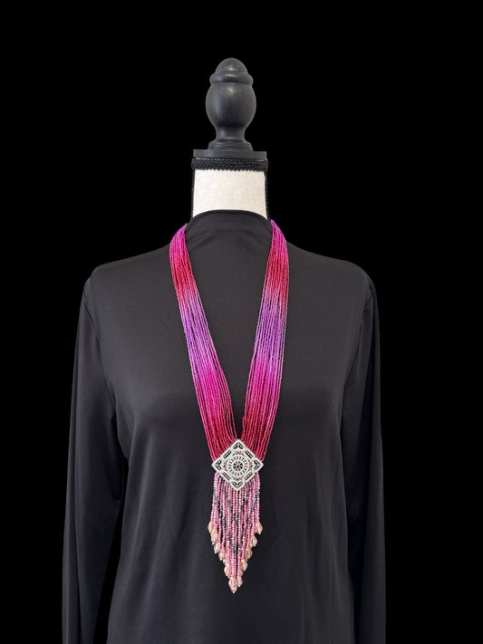 Long Shaded Small Crystal Beaded Square Pendant Necklace with Heavy Tassel Purple