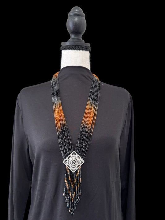 Long Shaded Small Crystal Beaded Square Pendant Necklace with Heavy Tassel Black