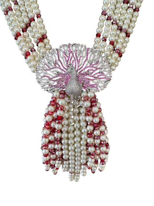 6 Line Pearl And Crystal Necklace Peacock Pendant Red