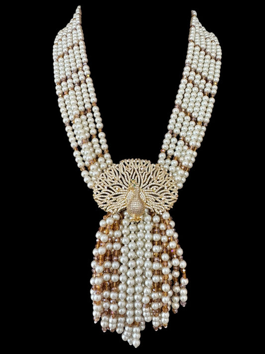 The 6 Line Pearl and Crystal Necklace with Peacock Pendant boasts six strands of pearls and crystals, creating a layered, opulent look. The pendant features a beautifully detailed peacock, adorned with intricate beadwork and crystals to add a touch of regal elegance and charm to the necklace.