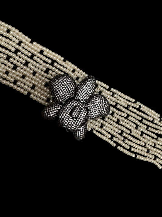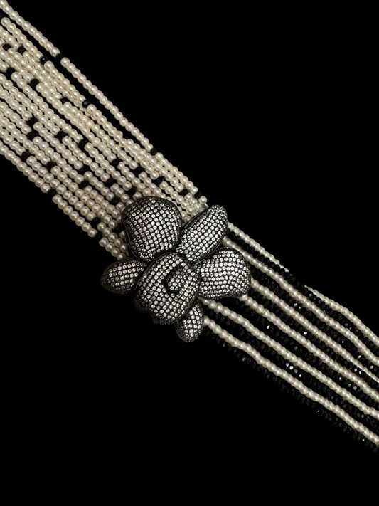 The Pearl Choker with Crystal Touch is a sophisticated piece of jewelry that blends classic charm with modern elegance. This choker features a strand of lustrous pearls, each selected for their impeccable sheen and smooth texture, creating a timeless and elegant look. The centerpiece is an intricately designed orchid pendant, enhanced with finely set crystals that add a dazzling sparkle. These crystals catch the light beautifully, providing a refined and glamorous touch. Pair it with an elegant dress for special occasions or a chic blouse for an elevated everyday look. This versatile piece is a must-have addition to any jewelry collection.