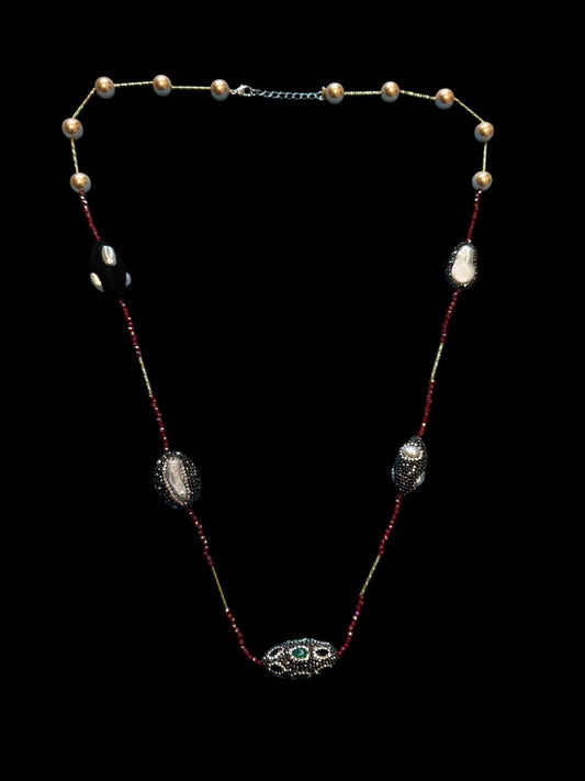 Single Line Pearl and Turkish Bead Crystal Necklace Red