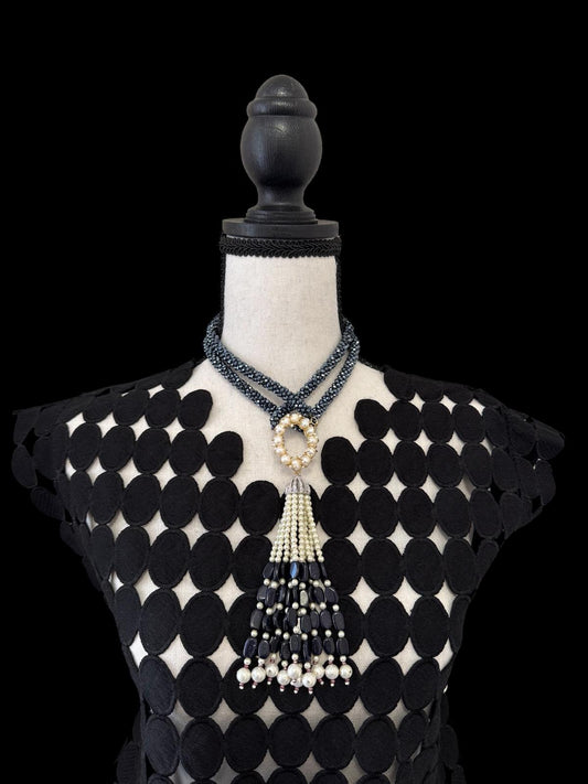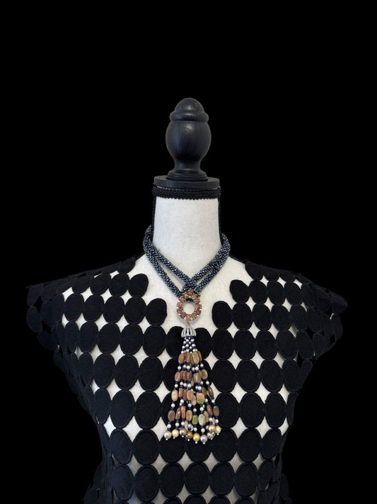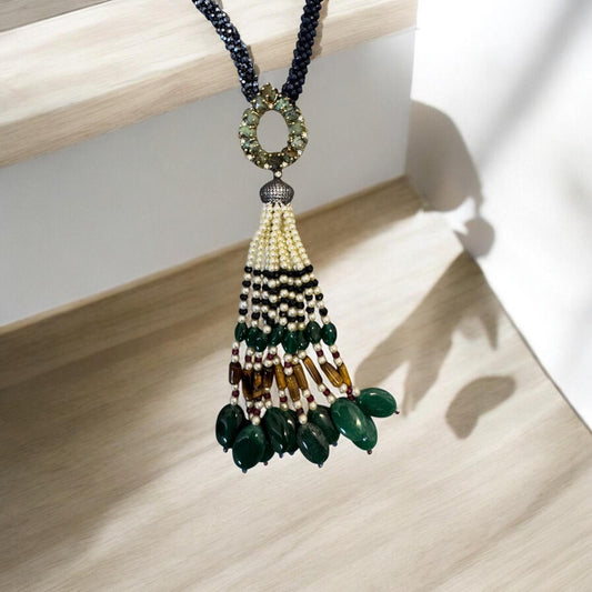 The Twisted Crystal Long Necklace with Semi Precious Pendant and Tassel combines elegance with bohemian flair. Multiple strands of twisted crystals shimmer beautifully. A unique, semi-precious pendant lies at the center, with a fine bead tassel adding sophistication. This long necklace, falling gracefully over the chest, elevates both casual and formal attire. Its intricate details and luxurious materials make it a standout piece, blending classic beauty and modern style.