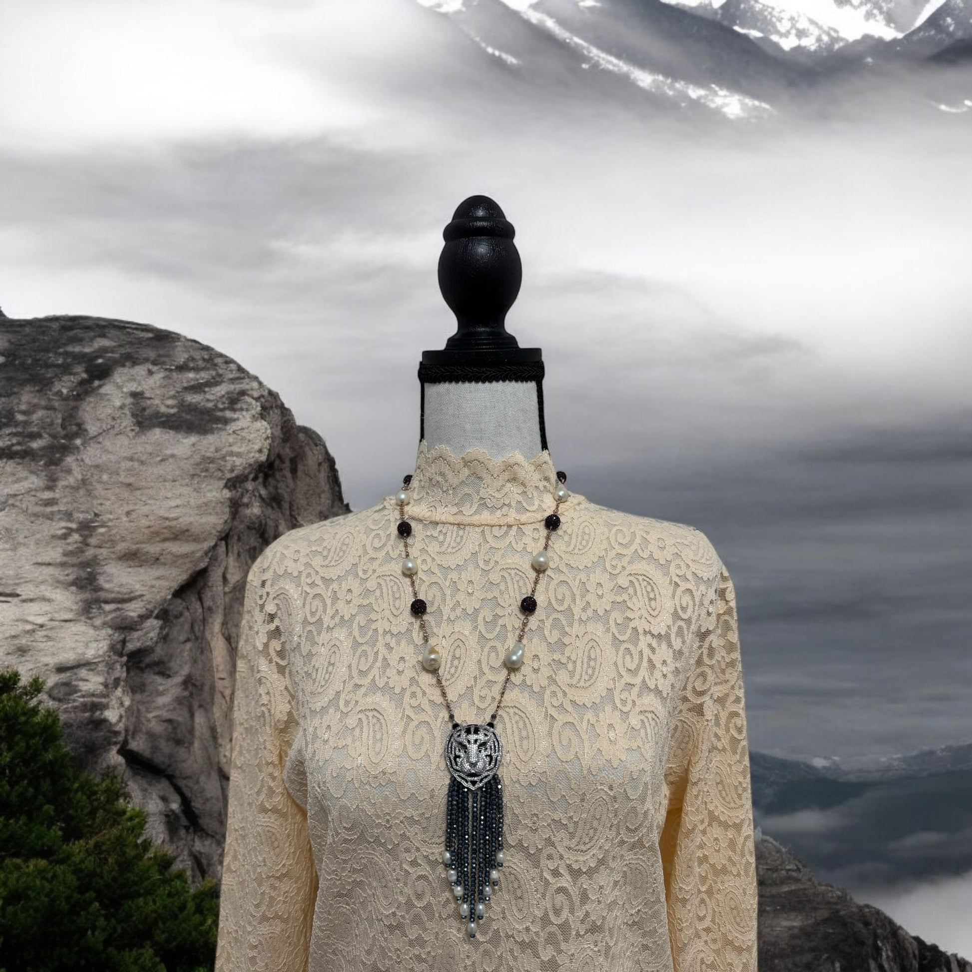 This stunning necklace features lustrous baroque pearls, high-quality crystals, and an intricate tiger face pendant adorned with shimmering zircon stones. The unique combination of materials and the bold, elegant design make it a versatile and eye-catching statement piece, perfect for both formal events and everyday wear. Add a touch of sophistication and fierce charm to your jewelry collection with this exquisite necklace.