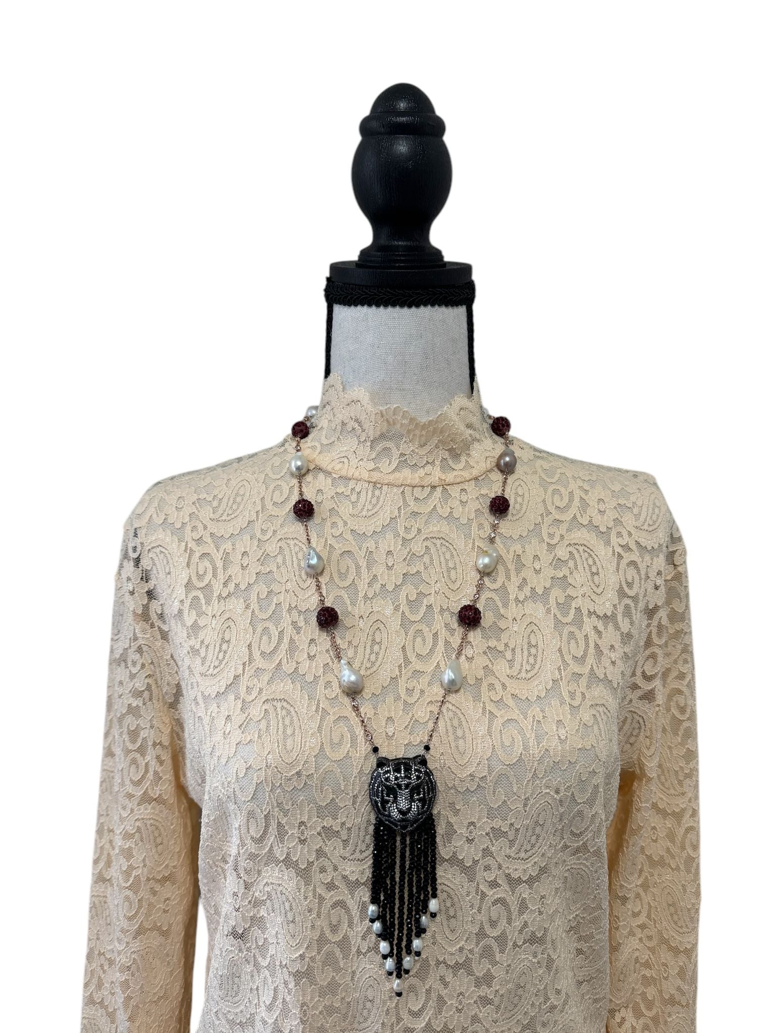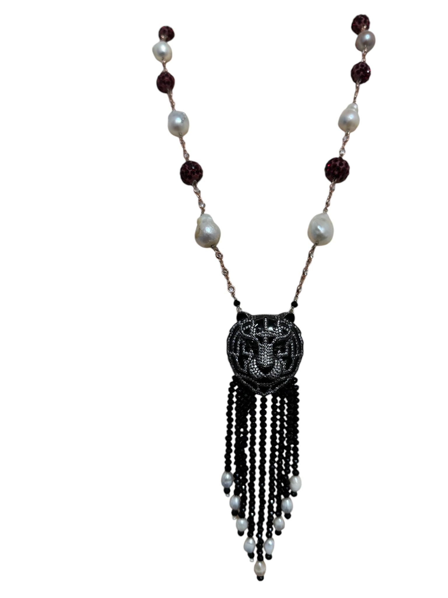 This stunning necklace features lustrous baroque pearls, high-quality crystals, and an intricate tiger face pendant adorned with shimmering zircon stones. The unique combination of materials and the bold, elegant design make it a versatile and eye-catching statement piece, perfect for both formal events and everyday wear. Add a touch of sophistication and fierce charm to your jewelry collection with this exquisite necklace.