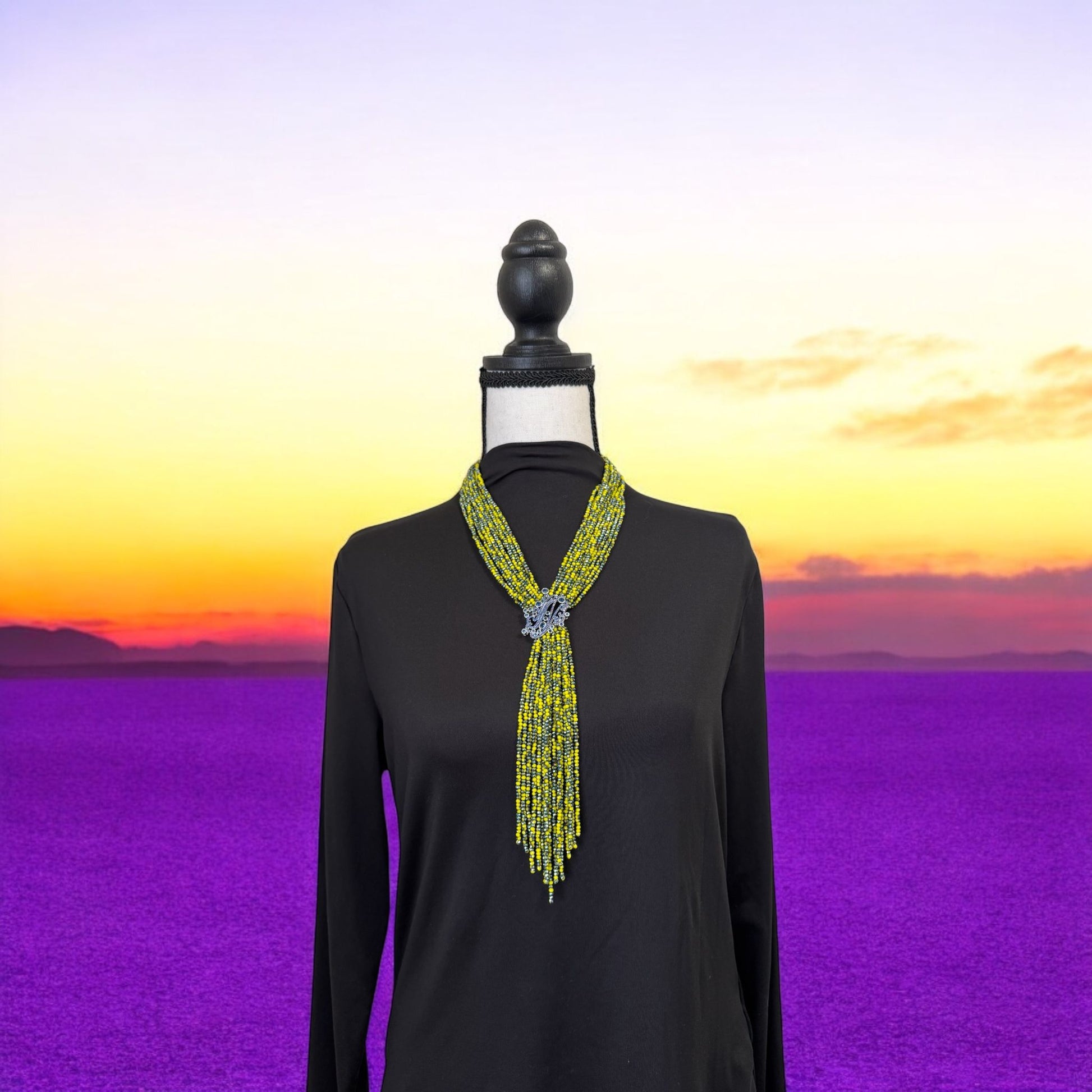 Tie Style Long Beaded Necklace with Pendant Yellow