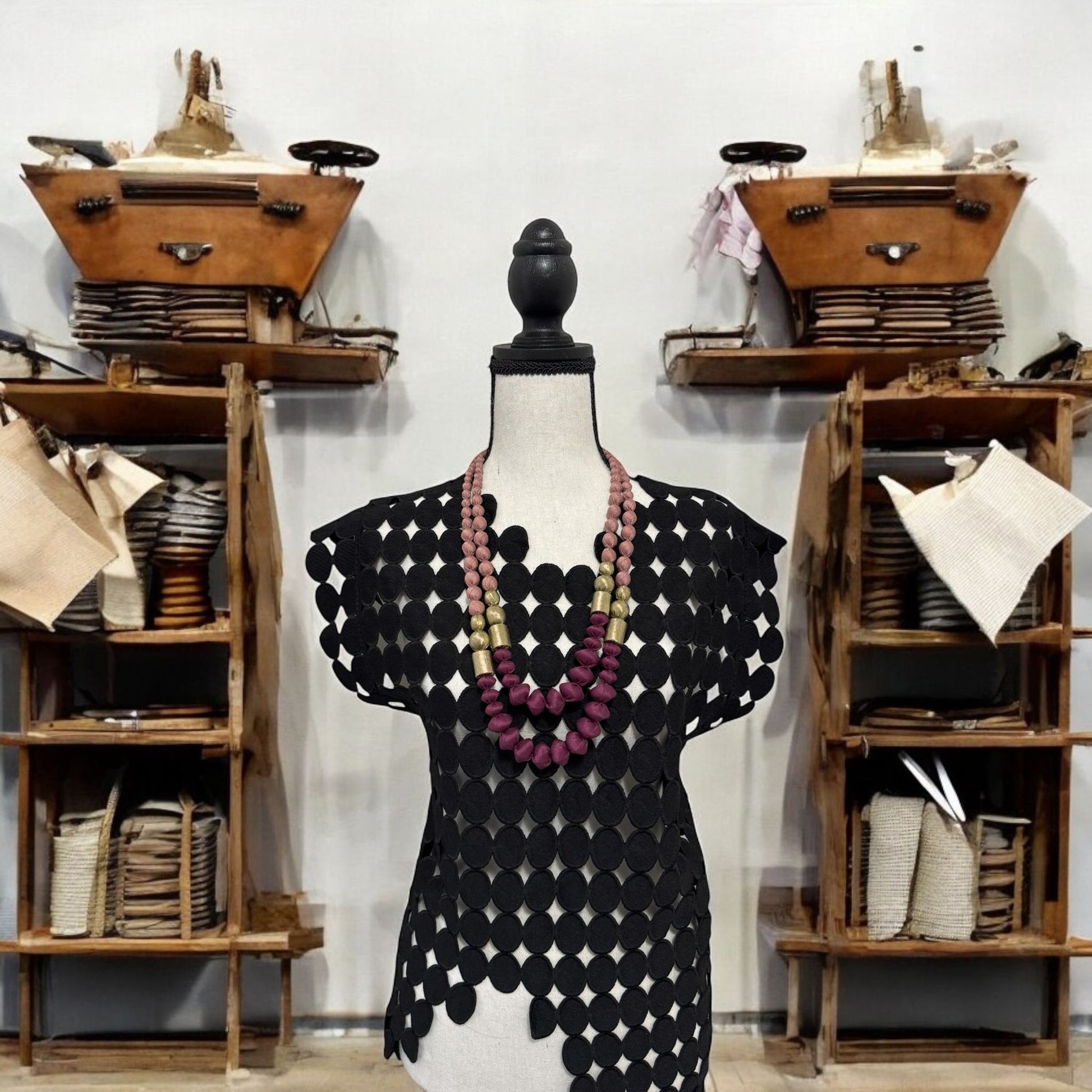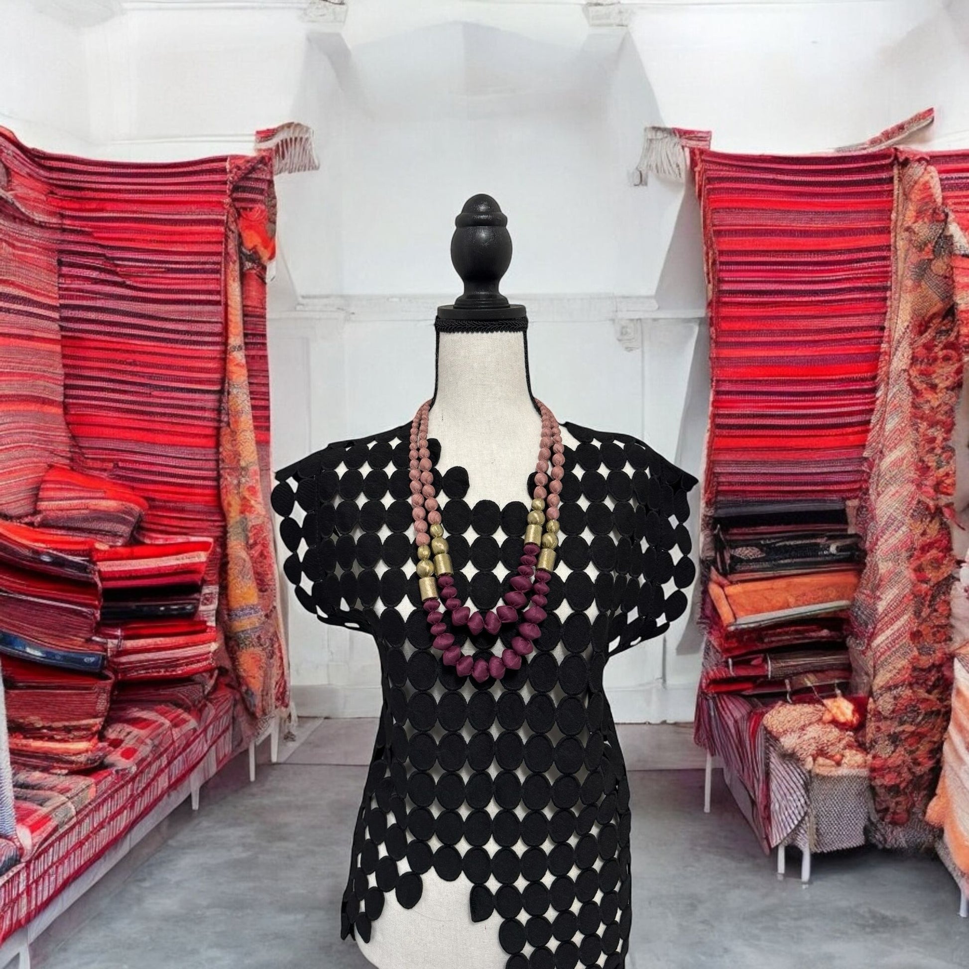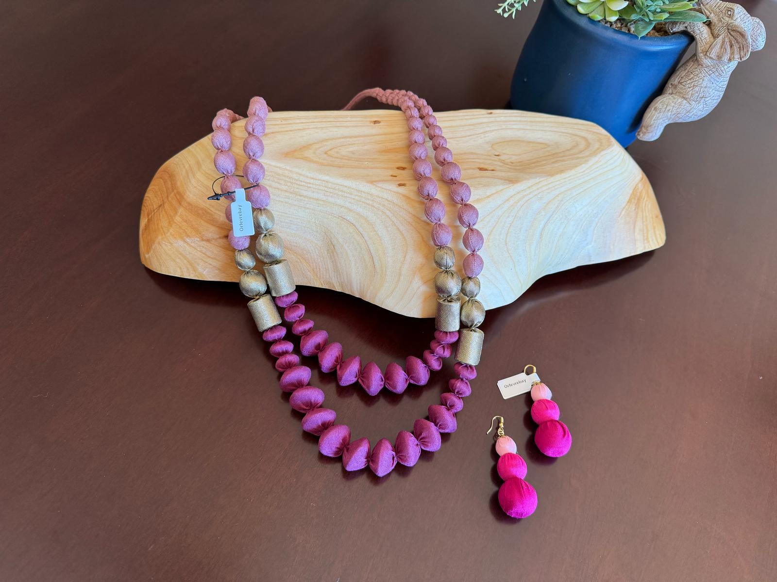 This vibrant necklace features layers of colorful, interwoven textile strands, creating a captivating and unique design. The rich palette of colors and varying lengths add depth and dimension, making it a striking statement piece. Perfect for both casual and formal outfits, this necklace brings a playful yet sophisticated touch to any ensemble.